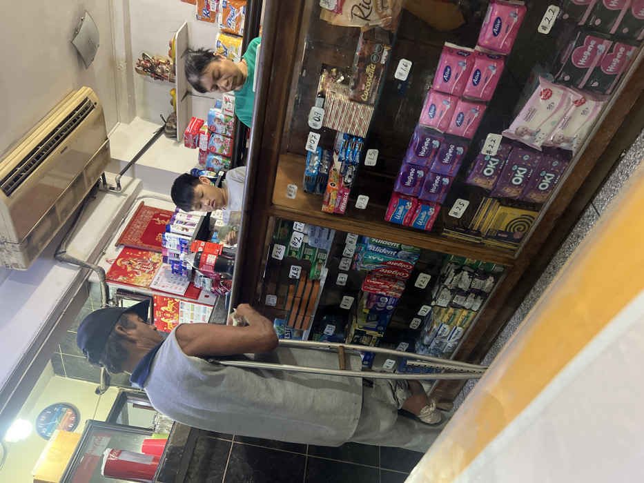 The image captures an indoor scene with a variety of products on display in a shop. On the shelves are items like "Hugine" and "Alive" sanitary napkins, along with "Colgate" and "Alident" toothpaste. Prices are marked with handwritten tags such as "#2.5" and "#2.2." A woman and a boy appear to be browsing the merchandise, while an elderly man with crutches is also present. The setting is reminiscent of a small, possibly family-run, retail establishment.