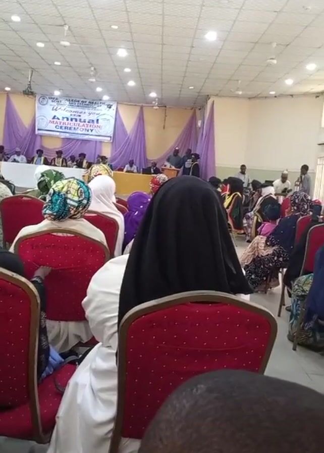 n indoor scene of an event taking place in a large, well-lit hall. The hall is filled with people seated in red chairs, facing a stage at the front. The majority of attendees are women, many of whom are wearing traditional Muslim headscarves in various colors and patterns. A banner on the stage reads "ANNUAL MATRICULATION CEREMONY" along with other text. A group of individuals is seated at tables on the stage, some standing and speaking. The video is taken from the perspective of someone sitting in the audience. The lighting is bright, and the atmosphere appears formal and orderly.