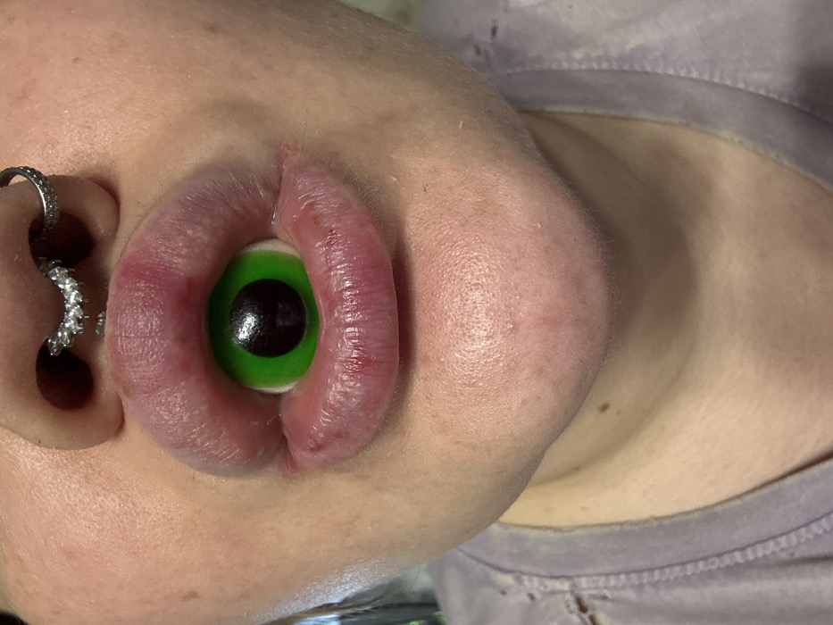 This image depicts a close-up scene, reportedly located in the city of Saratov, Russia. The primary subject is a human face, specifically the area encompassing the lower nose, mouth, chin, and portions of the neck and shoulders. The individual's lips are puckered and distended, forming an 'O' shape around a spherical, green and black confectionery item, commonly referred to as an 'eyeball candy.' The candy features a prominent black center, simulating a pupil, surrounded by a bright green iris-like layer. The skin appears fair with visible pores and minor surface irregularities. The upper lip shows areas of localized redness. The individual wears a septum piercing, which is a curved barbell adorned with multiple clear, faceted gemstones, and a simple metal ring piercing on the right nostril. A light-colored, possibly pale purple or gray, garment with visible stitching and slight texture is worn on the shoulders. The background is out of focus and indistinct, providing no specific environmental details.