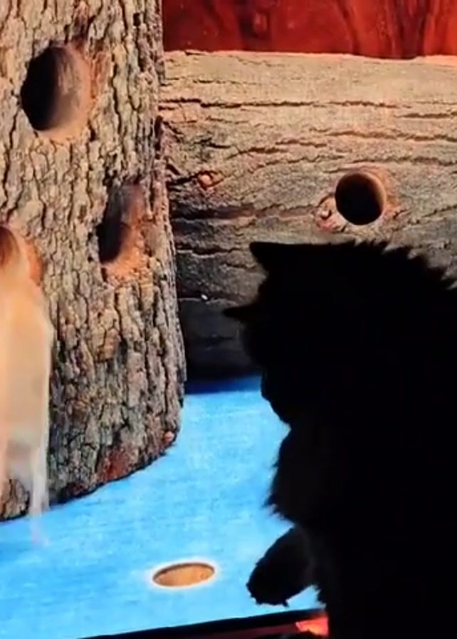 A black cat sits in front of a television screen. The screen shows a video with two light-brown mice in a diorama with cut wood logs and a bird house on a blue surface. The cat is focused on the screen, and it reaches out with a paw toward the mice.