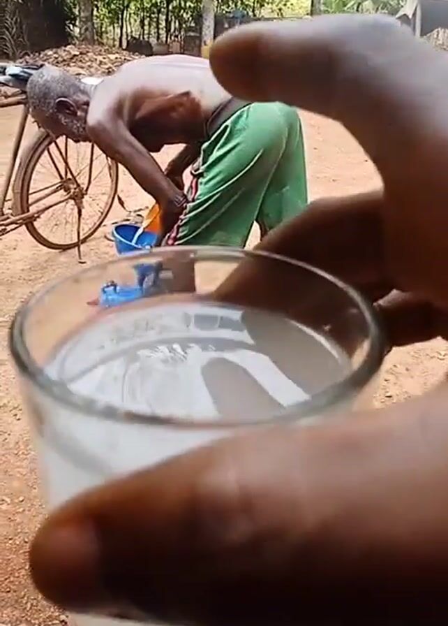 An eye-level shot shows a hand holding a clear glass filled with a white liquid in the foreground, with an older man bent over and handling containers in the background. The older man is dark-skinned, shirtless, and wearing green shorts with a dark waistband. He stands amidst several blue plastic containers and a large glass jug on a red dirt surface. He appears to be transferring liquid using a funnel. To the left of the man, there is a bicycle with a rack on the back. The background features greenery, trees, and a partial view of a block wall. The sky is overcast. The focus is shared between the glass in the foreground and the activity of the man in the background.