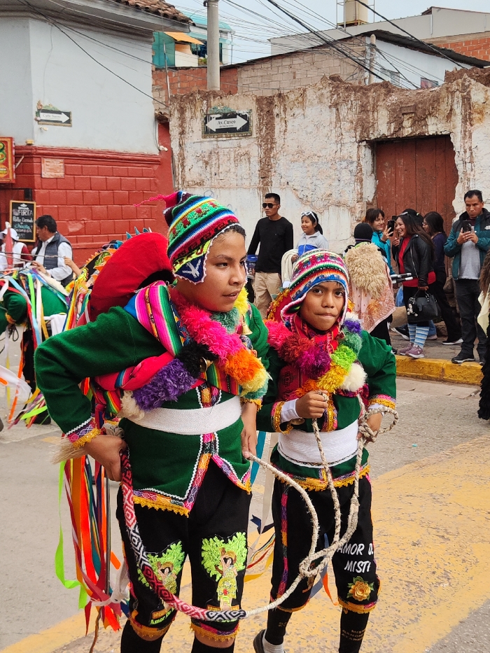 Two young individuals in traditional Andean attire are positioned prominently. They wear vibrant, green-and-black outfits with colorful hats and garlands. Each holds a rope. The boy on the right has the words "Amor de Misti" on his pants. A diverse group of people are visible in the background, some taking photos. The setting appears to be a street with older buildings, including brick structures and a weathered white building with a street sign. A painted crosswalk line can be seen on the street.