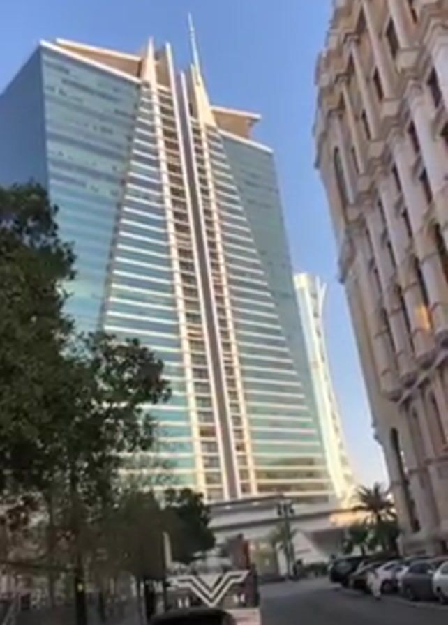 The video presents a view of a street lined with parked cars, flanked by two architecturally distinct buildings. On the left stands a modern glass-clad skyscraper, its shape resembling a triangular prism. To the right, an older, ornate building features light-colored stonework, detailed windows, and classical architectural elements. Small trees line the sidewalk in front of the skyscraper. The sky is clear and blue.