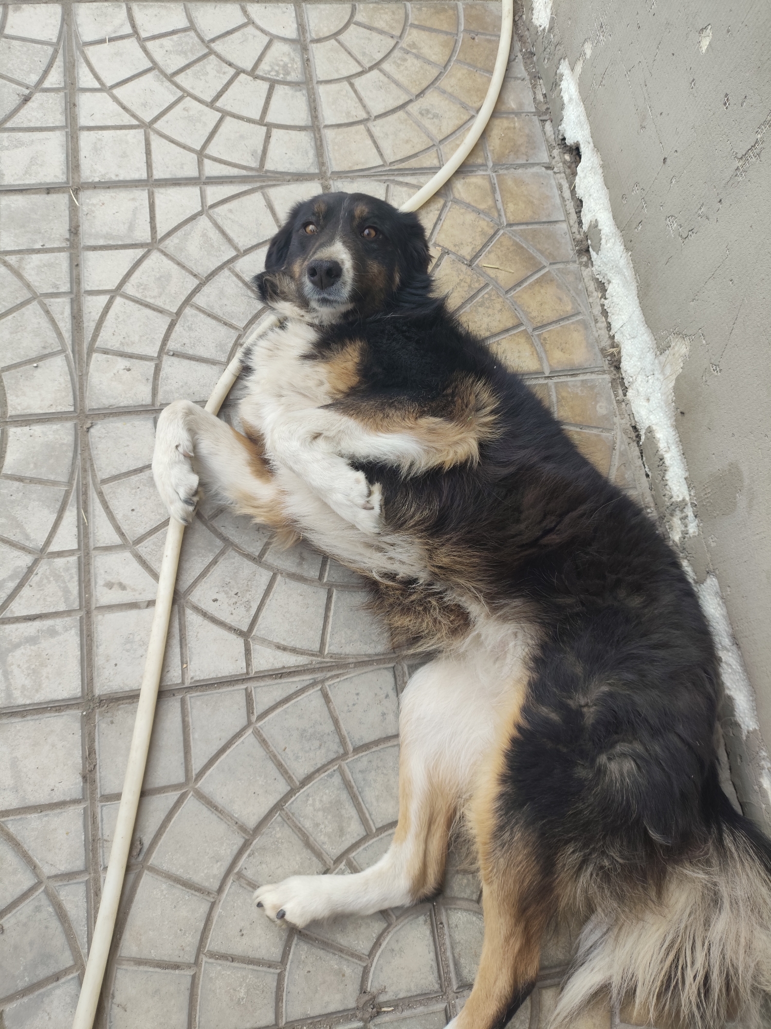 A medium-sized dog with predominantly black and tan fur, and some white markings, is lying on a patterned tiled surface. The dog's head is facing the camera with both eyes visible. It is resting with its front paws wrapped around a white plastic pipe. The tiled surface is grey with a circular pattern. Adjacent to the tiles is a rough, unfinished wall. The location of the image is in Yerzhovo, Moldova.
