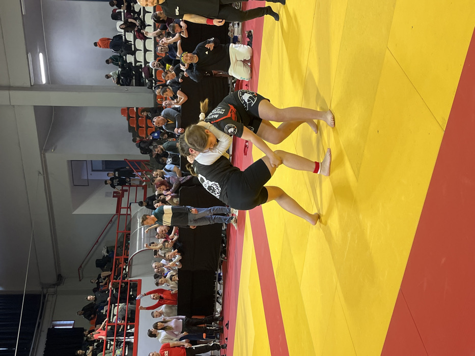 An indoor sports competition is underway in a sports hall located in Градска општина Пантелеј, Serbia. Two female athletes are actively grappling on a prominent yellow and red mat in the foreground. The athlete on the left wears a black short-sleeved top with a white graphic, black shorts, and a red and white band on her left ankle. The athlete on the right wears a similar black short-sleeved top with a white graphic and black shorts. Both are barefoot and engaged in a stand-up clinch. Behind the athletes, a crowd of spectators is visible, separated by a dark barrier. Individuals are standing and seated in tiered orange and white bleachers. Several spectators have their arms raised, indicating active observation or cheering. A male in a striped shirt stands directly behind the barrier, observing the match. To the right, another male in a black shirt and white shorts kneels, gesturing with his hands. A partial view of a male in a black shirt with "UFC" branding is seen on the far right. The venue features light-colored walls, overhead fluorescent lighting, and red-railed staircases leading to upper seating areas.