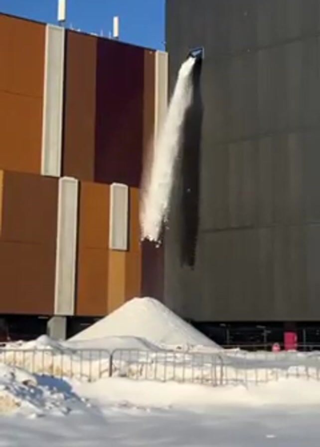Snow is being expelled from an opening on the side of a tall, gray building, forming a large pile on the snowy ground below. The building is adjacent to a multicolored building with vertical stripes of brown and maroon. A metal fence surrounds the growing pile of snow. The sky is clear and blue.