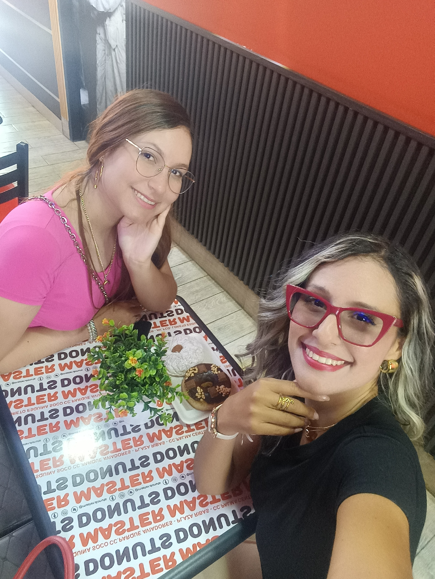 Two adult females are seated at a table within an indoor commercial establishment in La Victoria, Venezuela, likely a donut shop or cafe