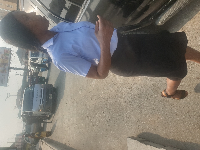 A woman in a light blue short-sleeved shirt and a dark skirt stands near a black vehicle on a city street. She wears brown sandals. The street contains moving vehicles, including a white truck. There is a tall billboard on the left. The image is taken on a sunny day with the camera positioned at a low angle.