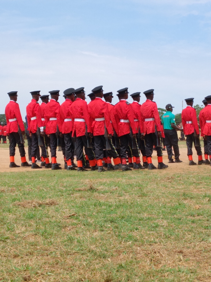 The image depicts an outdoor scene on an open parade ground or field in Kaduna, Nigeria, under a light blue sky with scattered white clouds