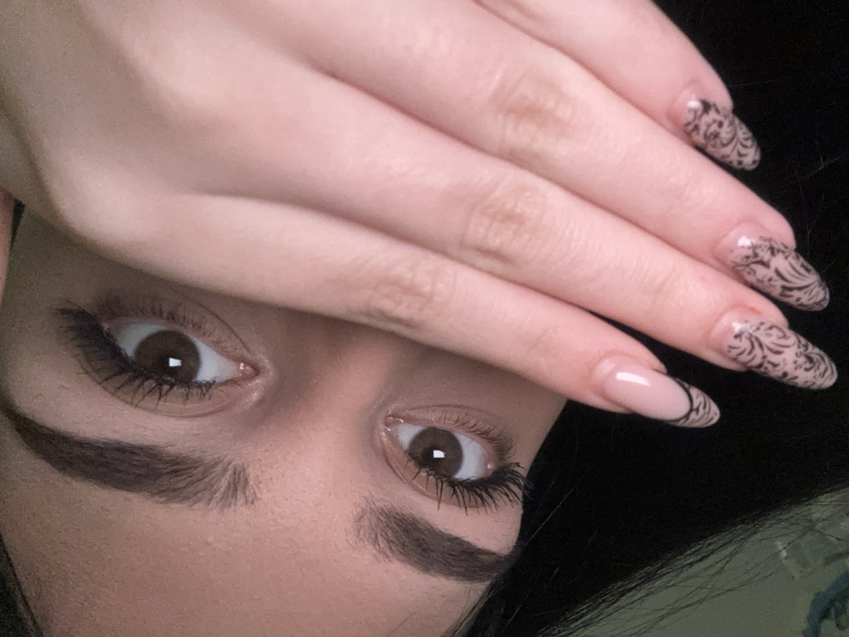 The image displays a close-up, diagonally oriented view of a person's upper face and right hand, captured in the city of Razgrad, Bulgaria. The subject's two brown eyes are open and directed towards the viewer, featuring prominent dark eyelashes and well-defined, dark eyebrows. A distinct square reflection of a light source is visible in each pupil. The person's right hand is positioned across the lower portion of the face, obscuring the nose and mouth. The visible fingernails are long, almond-shaped, and manicured with a light pink base. The index finger nail has a black French tip line with a black intricate pattern extending onto the base. The middle and ring finger nails feature a full black scrollwork pattern. Dark hair is visible along the left edge of the frame. The background is uniformly dark and indistinct, suggesting an indoor setting with ambient or low lighting.