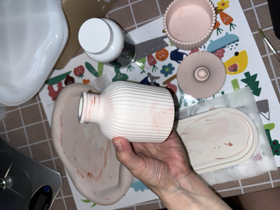 A human hand holds a light-colored, vertically ribbed, cylindrical vase exhibiting faint pink marbling and streaks, consistent with a crafting process. The vase has a flared rim and a narrow neck. The hand is positioned centrally in the image. On a checkered fabric surface, partially covered by decorative paper featuring cartoon fruits and vegetables, several crafting items are present. To the upper left, a silver digital scale with a black display is visible. To the left and below the held vase, an elongated oval tray and a rectangular tray, both light-colored with pink swirled patterns, rest on white paper. To the right of the vase, a white bottle with a white screw-top cap is present. In the lower right, a light pink, ribbed circular container with a matching fluted lid is positioned. A small paintbrush with a brown handle and silver ferrule is visible in the bottom right corner. The specific location within Podolsk, Russia, or any city, cannot be determined from the provided image.