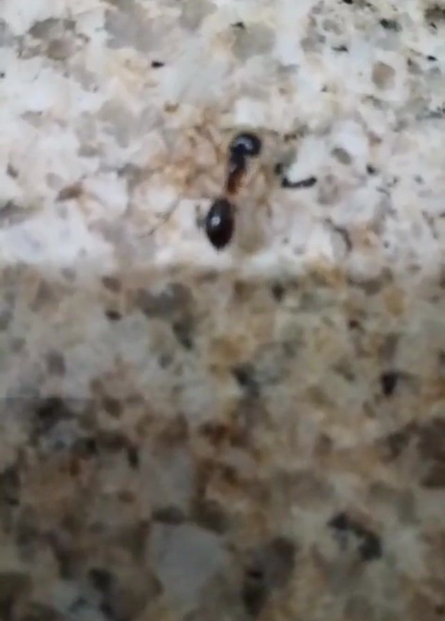 single ant walking on a light brown and beige countertop with a speckled pattern