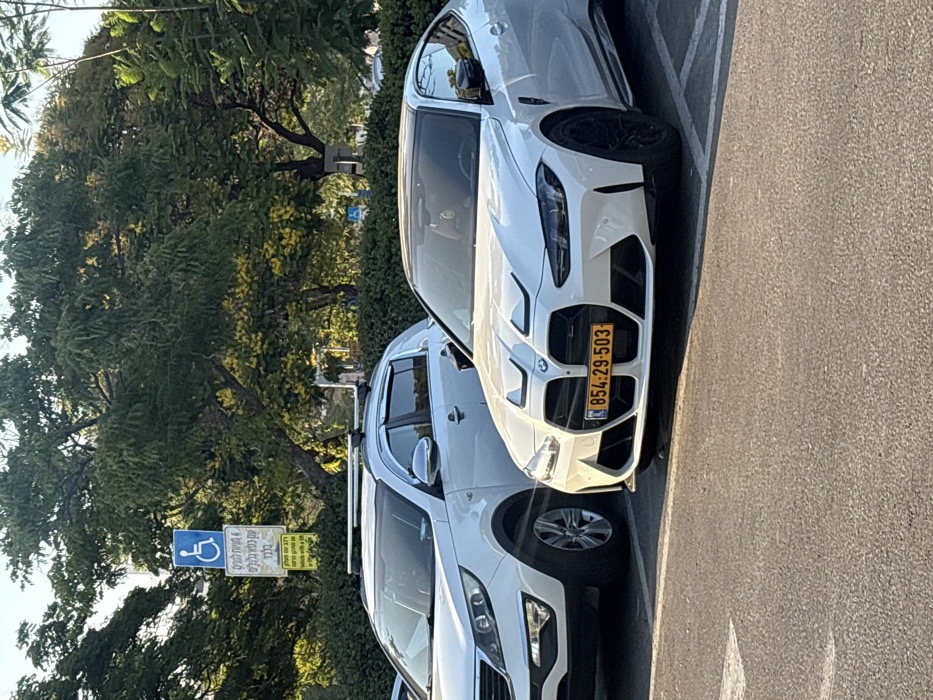 The scene captures an outdoor parking area in Ramat Gan, Israel, under daylight conditions. A white BMW M4 Coupe (G82 generation) is positioned in the central foreground, angled towards the viewer's right, displaying an Israeli license plate, 854:29-503, on its front bumper. This vehicle features a black roof and black multi-spoke wheels. A white Kia Sportage SUV, equipped with silver roof rails, is partially visible parked directly behind and to the left of the BMW. In the left background, a blue and white regulatory sign is mounted on a pole, depicting a wheelchair symbol and containing Hebrew text that translates to "Parking for authorized with a wheelchair," indicating a designated handicapped parking space. The ground consists of asphalt paving with a white parking line visible in the immediate foreground. Lush green trees and dense foliage form the background, suggesting a landscaped environment. No individuals are visible.