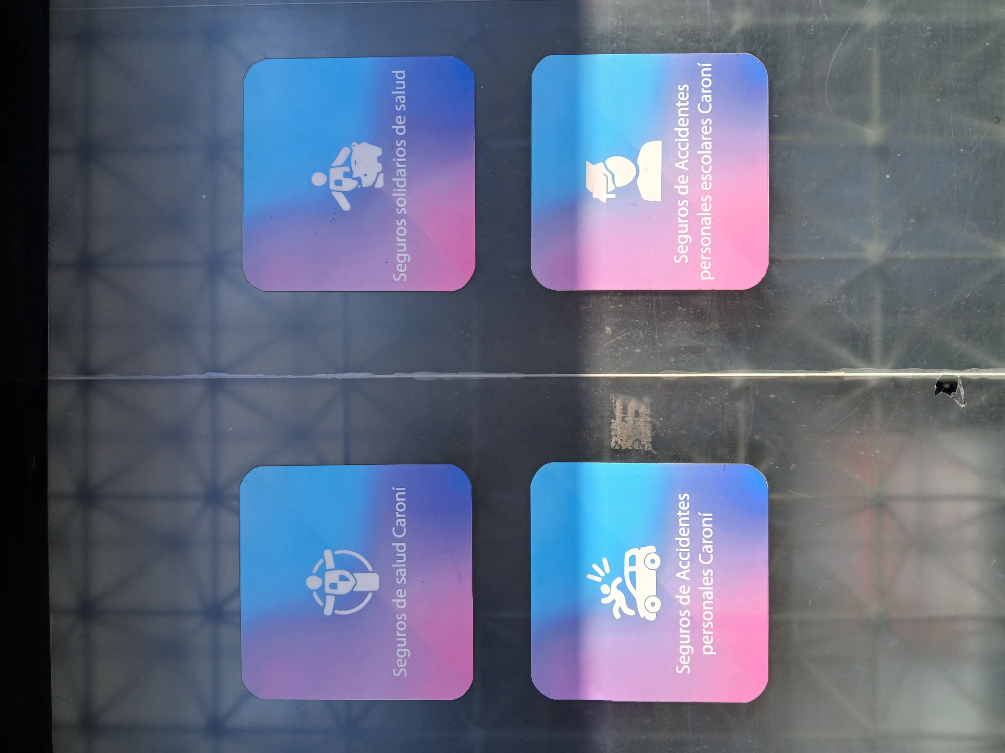 four square signs with rounded corners, mounted on a surface that appears to be glass or a similar transparent material. The signs are arranged in a 2x2 grid. Each sign features a gradient color scheme transitioning from blue at the top to pink at the bottom. Each sign displays a white icon and text in Spanish. The top left sign shows an icon of a figure apparently being supported or aided by two surrounding figures, with the text "Seguros solidarios de salud" (Solidarity health insurance). The top right sign features an icon depicting a person wearing a graduation cap, with the text "Seguros de Accidentes personales escolares Caroní" (Caroni personal school accident insurance). The bottom left sign displays an icon of a stick figure in a wheelchair, with the text "Seguros de salud Caroní" (Caroni health insurance). The bottom right sign depicts a car hitting a stick figure, with the text "Seguros de Accidentes personales Caroní" (Caroni personal accident insurance). The signs are likely advertisements for insurance services, specifically related to health and accidents, offered by a company named "Caroní." The image might have been taken in the city of Ciudad Guayana, Venezuela, as the name "Caroni" is associated with that region. The surface on which the signs are mounted has a pattern of reflected squares.