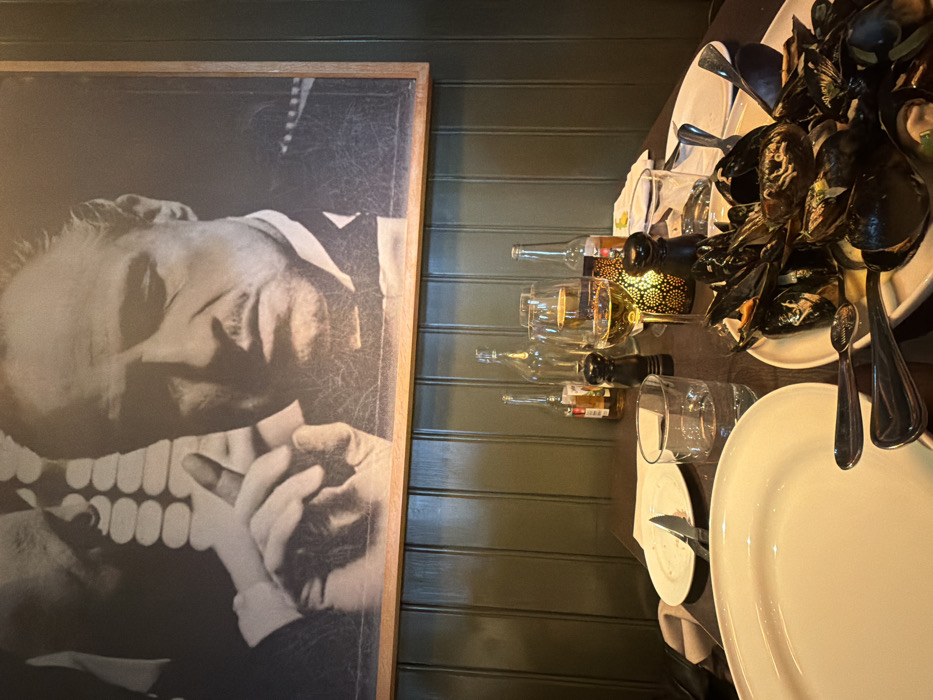 The image displays an indoor dining scene within a restaurant located in Lillestrøm, Norway. A dark wooden table in the foreground holds the remnants and setup for a meal. On the left, a large empty white oval platter and a smaller, mostly cleared white plate with a knife are visible, alongside a clear glass tumbler containing water. Centrally, a white rectangular dish is filled with cooked mussels in their shells, some submerged in a yellowish broth, with lemon pieces and serving utensils. Further on the table, a stemmed glass holds white wine, with another similar glass partially obscured. Two amber-colored bottles, consistent with beer bottles, and an empty clear glass bottle are present. A decorative gold-colored lantern with intricate cutouts provides ambient light, flanked by two dark-colored salt and pepper grinders. Above the dining area, a large framed black and white portrait of Marlon Brando as Vito Corleone from *The Godfather* is mounted on the wall. The lower section of the wall features dark green vertical wooden paneling. No individuals are visible in the scene.