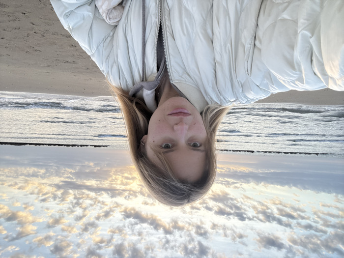 A woman wearing a light-colored puffer jacket stands on a beach. The water is in the background with a barrier in the distance. The sky is filled with clouds. The woman has fair skin and light brown hair.