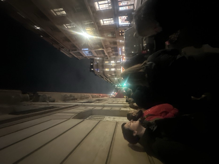 A dark, upward-tilted view reveals a multi-story building with illuminated windows against a night sky. Below, a group of people stands along a building's edge. The perspective creates a surreal effect, making the buildings appear to rise into the sky. A faint green light is visible amidst the figures. The scene is primarily lit by building lights, adding to the nocturnal urban ambiance.