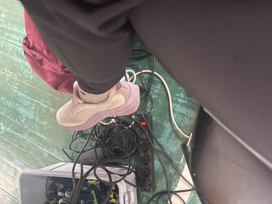 The scene depicts an indoor area from an overhead perspective, focused on a person's lower leg and the floor. The floor consists of distressed green-painted wooden planks, showing significant wear and chipped paint. A person's right leg is visible, dressed in dark trousers and a light-colored athletic shoe, specifically an ANTA branded sneaker with a beige upper and a prominent light purple sole. A light-colored sock is visible between the shoe and the trouser cuff. On the floor, a black five-outlet power strip with a lit red power switch is present, entangled with numerous black and white electrical cables. One black power cord is plugged into the power strip. To the left of the power strip, a white plastic storage bin contains multiple small items, some exhibiting green and yellow accents. A piece of bunched dark red fabric rests near the person's leg. A portion of a dark, possibly black leather or vinyl, seat is visible in the lower left foreground. The specific location within Tayshet, Russia, is not discernible from the image.