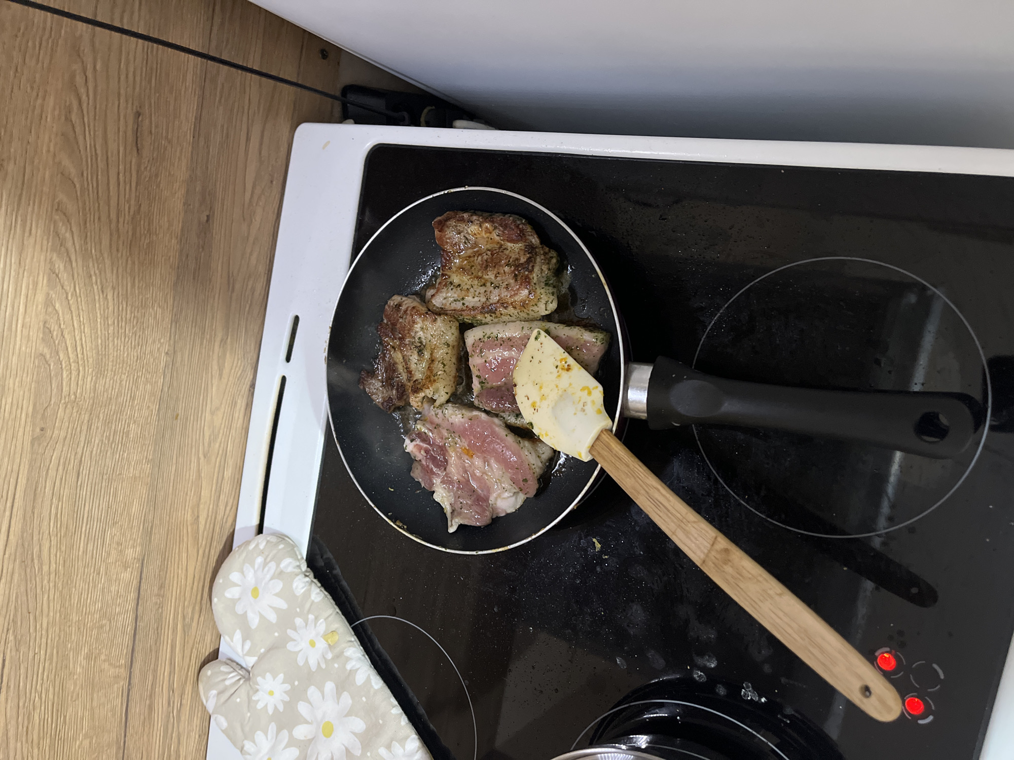 A top-down shot shows a black frying pan containing four pieces of seasoned meat being cooked on a black glass-top stove. A beige and white floral oven mitt is visible on the lower left, and a beige spatula with a wooden handle rests in the pan. The stove is white-trimmed and positioned on a wooden countertop. The lower right corner reveals red illuminated buttons on the stove's surface. Location: Shumen, Bulgaria is undetermined.