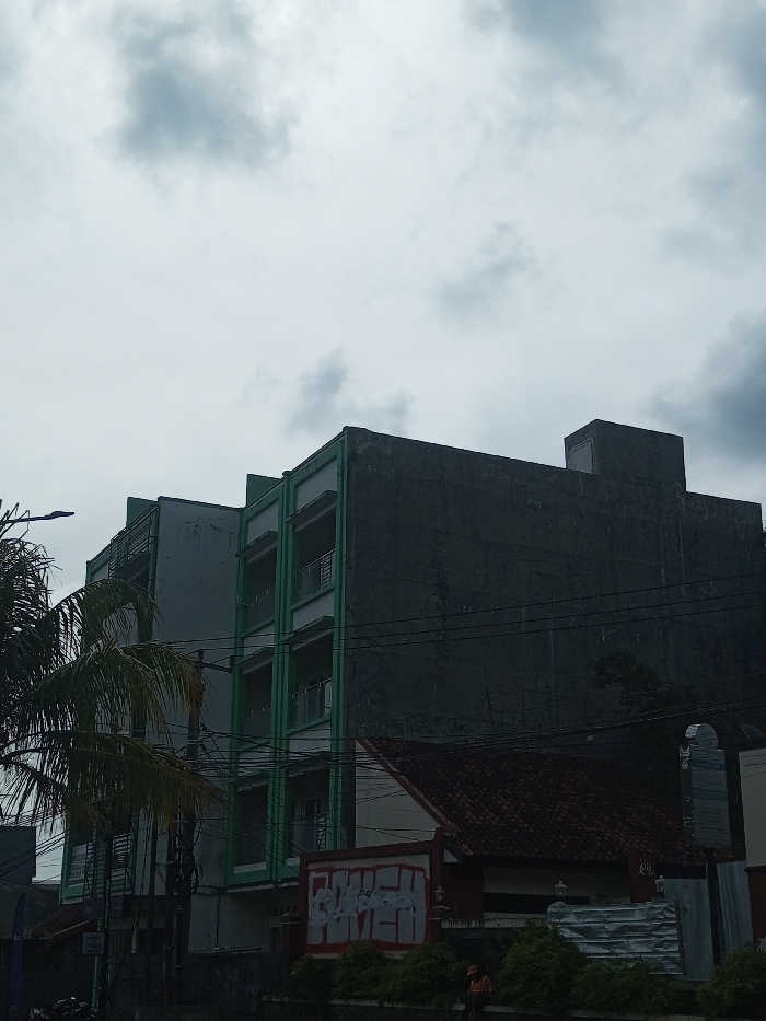 A medium shot captures a multi-story building under a cloudy sky. The building's facade is characterized by a dark gray color with some light-colored accents and balconies. Palm trees are visible to the left. In front of the building, a small, one-story structure with a red tile roof is present, covered in graffiti. Power lines crisscross the foreground, adding visual clutter.