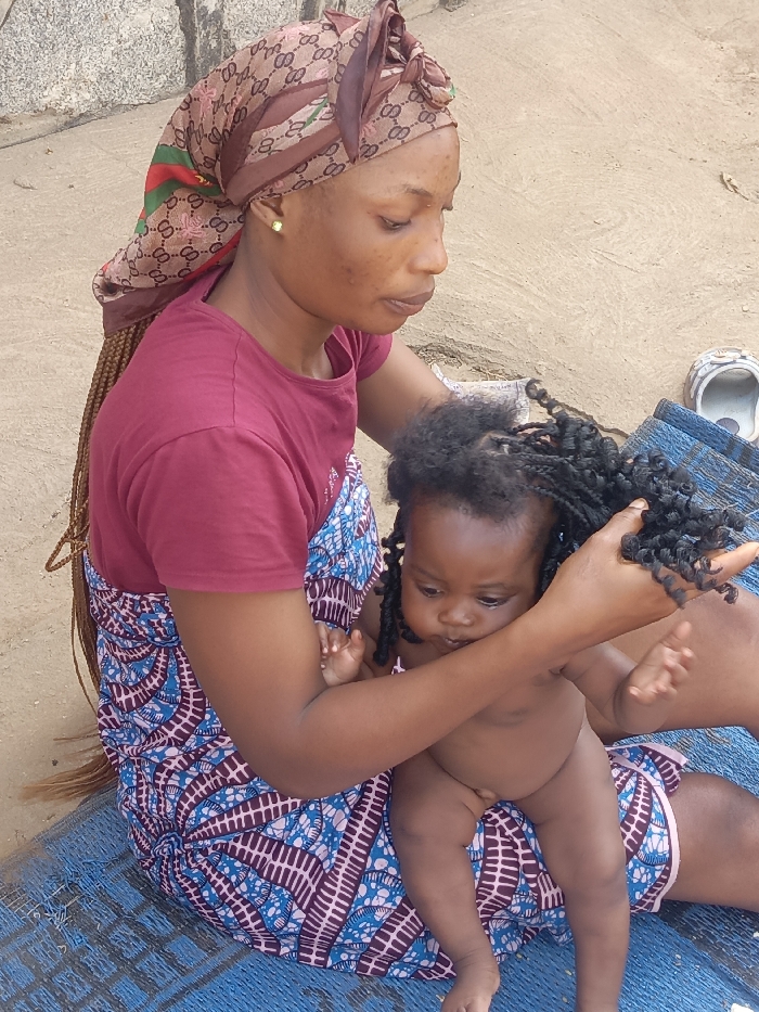 The scene, located in Akwanga, Nigeria, features an adult female interacting with an infant outdoors