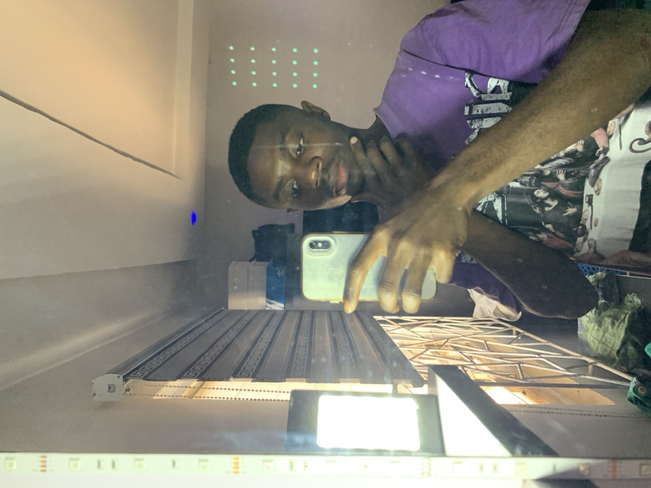An indoor mirror selfie taken in a room located in Jos, Nigeria. The image features a young male subject with dark skin and short dark hair, wearing a purple short-sleeved t-shirt with a graphic print resembling "The Last Supper." He is holding a silver-colored smartphone with his right hand to capture his reflection, while his left hand is positioned with fingers resting under his chin. The reflection in the mirror reveals various elements of the room: A vertical strip of white LED lights is visible on the left edge. To the left of the subject's reflection, a rectangular white light source sits on a surface, beside a window covered by horizontal blinds. Beyond the blinds, a metal security grill is partially visible. Above the blinds, white boxes, one bearing an Adidas logo, and dark objects are stacked. The ceiling, also reflected, is white with a subtle rectangular recess, and a small blue indicator light is visible. On the wall behind the subject, a grid pattern of green LED dots is present. Clutter, including a green patterned fabric, is visible on a surface or floor in the lower left reflection.