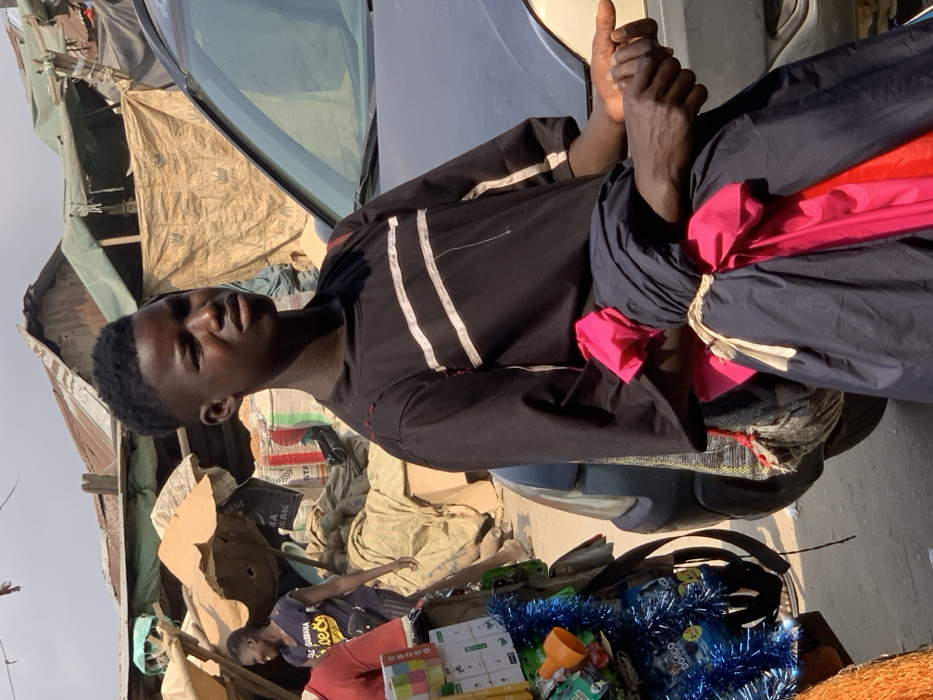 The image depicts an outdoor market scene in Onitsha, Nigeria. A young dark-skinned male is the central figure, positioned slightly to the right of the frame, looking directly towards the viewer with a neutral expression. He has short, dark hair with faded sides and wears a black short-sleeved t-shirt with two horizontal white stripes across the chest, showing visible wear or stitching near the shoulders. Over his left arm, he carries a bundle of folded fabrics in dark blue/black and bright pink/red, secured with a light-colored string. A mesh bag is visible behind his left arm. He appears to be standing beside or leaning against the front passenger side of a dark-colored vehicle, possibly an SUV, which occupies the right half of the mid-ground. To the left of the central figure, a partial view of a vendor's setup is visible, displaying various small packaged goods, some decorated with blue tinsel. In the background, a dark-skinned female wearing a dark t-shirt with yellow text walks to the left, smiling, past large stacks of white sacks, some labeled "RICE BAG" and bearing a crown logo. Further behind, various makeshift market stalls with corrugated metal roofs and fabric or tarp walls are visible under bright daylight, indicating a bustling commercial environment. The ground appears unpaved or dusty.