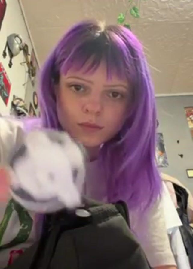 - "A person with purple hair and bangs is holding up two stickers" by FM-3WDDJ2, licensed under CC BY 4.0