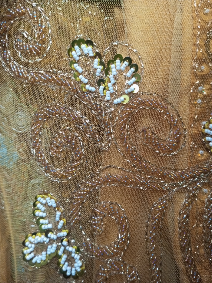 A close-up of a gold, sheer fabric adorned with intricate beadwork