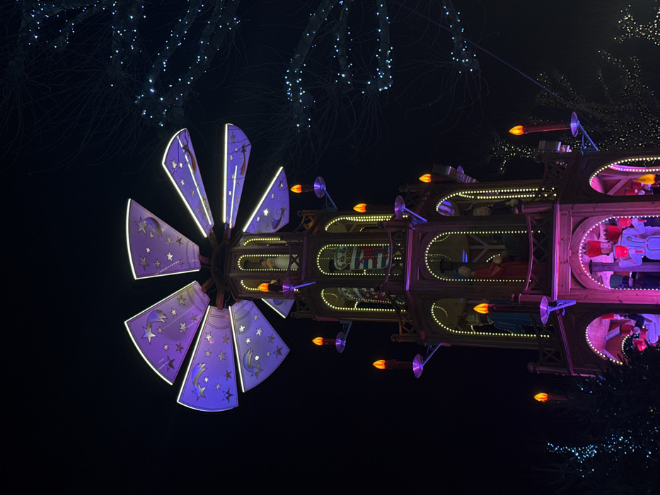 A brightly lit Christmas pyramid stands against a dark night sky. Its vanes, decorated with stars and moons, are illuminated with purple light. Several tiers house figures that appear to be characters, with candles lining the structure's edges. White string lights twinkle in the background.