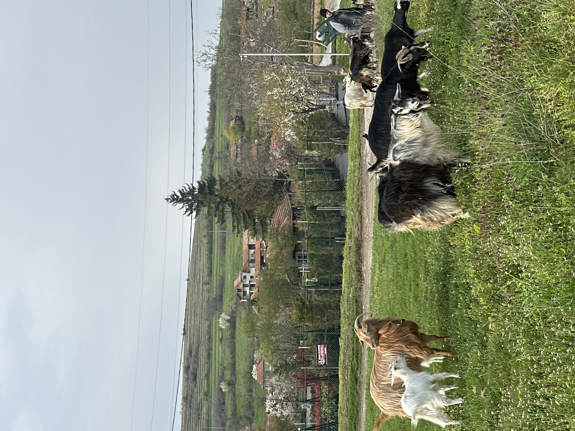 The image depicts a rural scene in Kutsina, Bulgaria, featuring a herd of goats grazing in a grassy field. The goats vary in color, including brown, white, and black. A person in dark clothing sits on a bench near the goats. In the background, there are houses, trees, vineyards, and power lines. The sky is overcast. The goats are interacting with each other and grazing on the grass.
