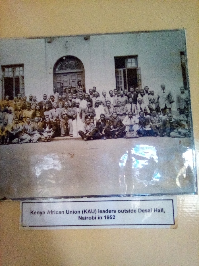 A framed, black-and-white historical photograph is affixed to a plain, light-colored wall. The photograph is covered by a reflective surface, causing a significant glare in the bottom right quadrant. Below the photograph, a white rectangular caption reads, "Kenya African Union (KAU) leaders outside Desai Hall, Nairobi in 1952." The photograph depicts a large group of approximately 60 to 70 adult African men posing for a formal portrait outdoors. The subjects are arranged in multiple rows: a back row stands, middle rows are seated on chairs, and a front row is seated directly on the ground. The men are predominantly dressed in Western-style formal attire from the mid-20th century, including suits, collared shirts, and ties, with some individuals wearing simpler shirts or traditional garments. They are all looking towards the camera. The background consists of a light-colored, multi-story building, identified as Desai Hall. The building features a prominent central arched doorway with double wooden doors, flanked on either side by rectangular windows with multiple panes. The ground in the foreground appears to be a flat, unpaved surface. The event depicted in the photograph took place in Nairobi, Kenya. This physical image is located in the city of South Sakwa ward, Kenya.