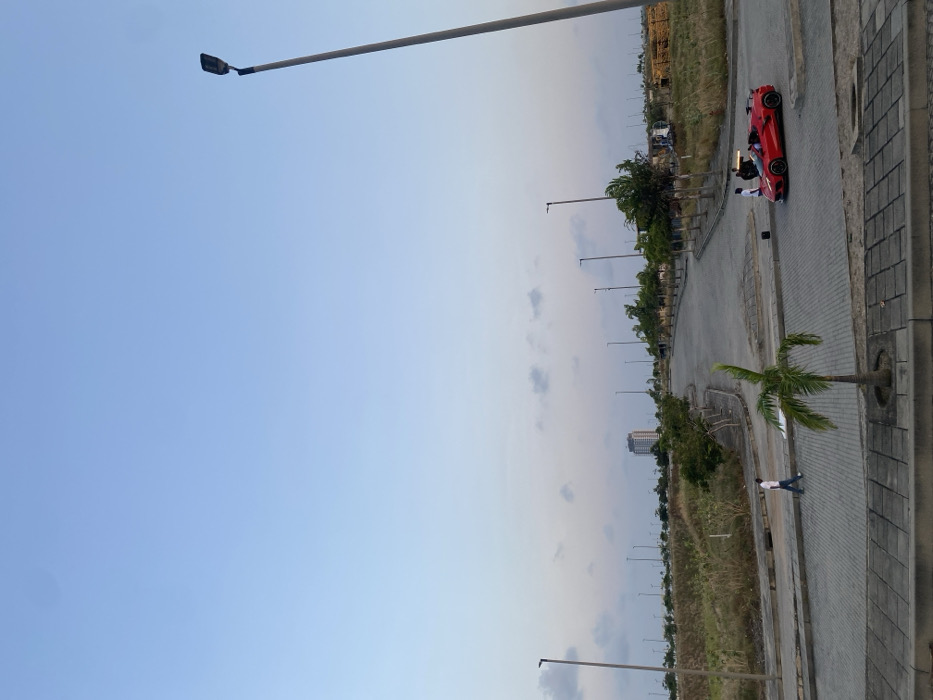 A sideways view showcases a paved road lined with palm trees and streetlights, beside a grassy area. A red sports car, with people nearby, is parked on the road. A lone man is seen walking along the pavement. The sky is a gradient of blue, paling as it nears the horizon. A tall, slender building is visible in the distance. A streetlight pole extends prominently into the sky in the upper left corner.