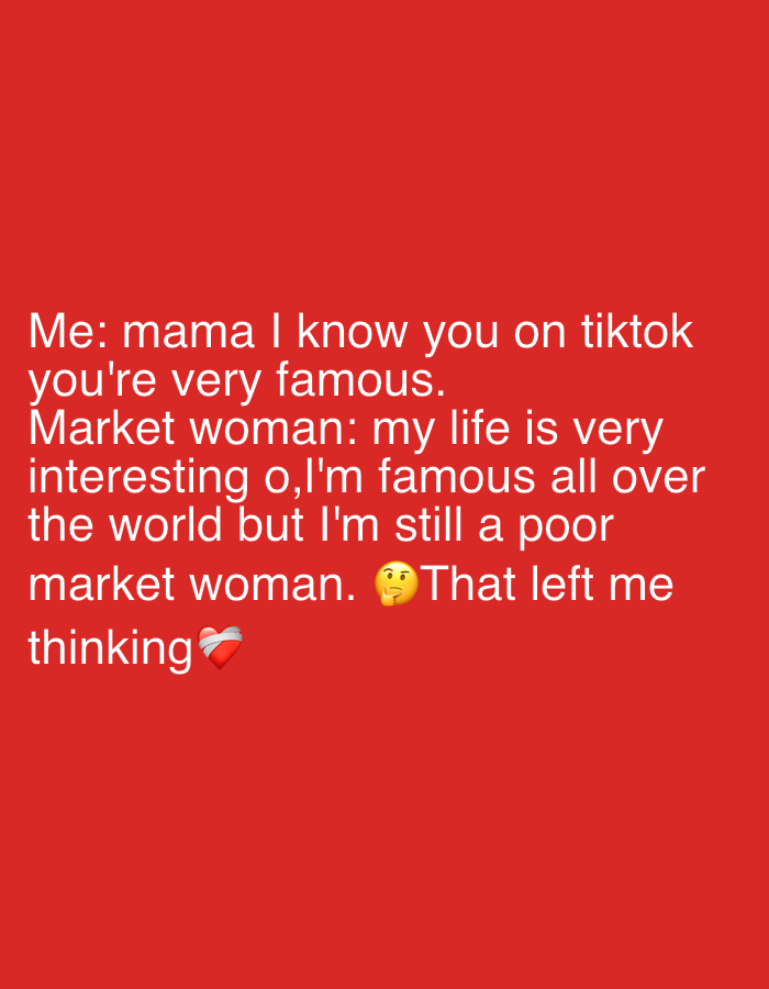 The image features text on a red background. The text describes a conversation where someone tells a market woman she is famous on TikTok. The market woman responds that her life is interesting and she's famous worldwide, yet remains a poor market woman. The text ends with "That left me thinking" accompanied by a thinking face emoji and a heart wrapped in a bandage emoji. The overall tone suggests reflection on fame and wealth disparity.