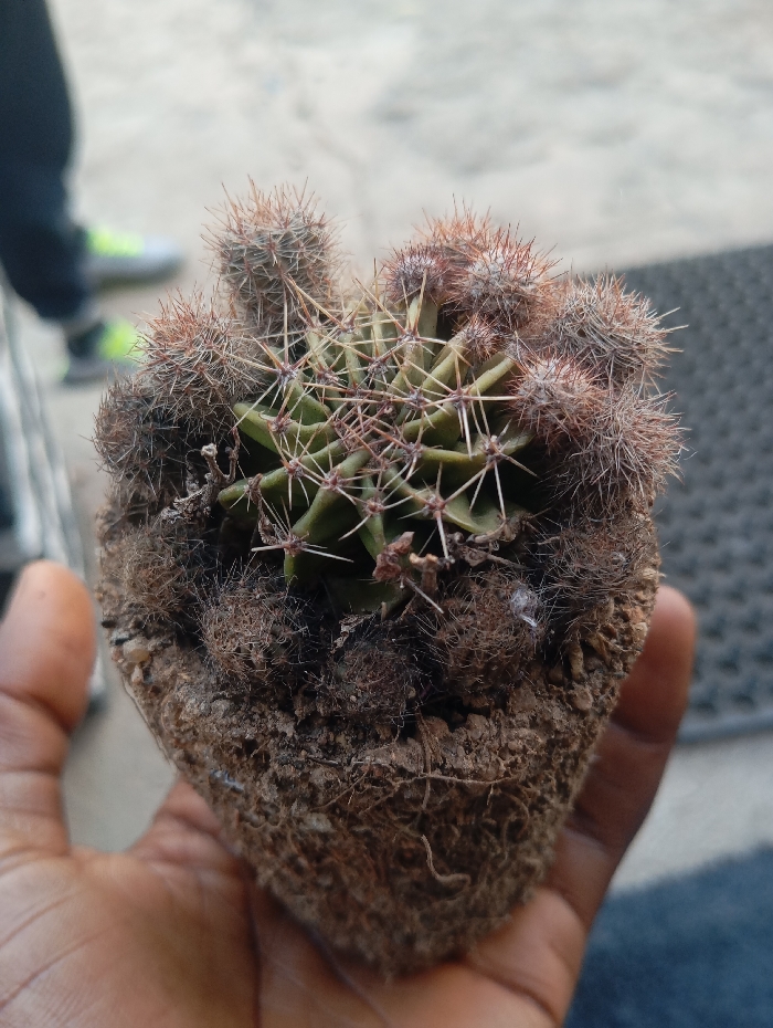 A close-up image depicts a dark-skinned human hand holding a small, multi-stemmed cactus plant, likely recently removed from its pot, revealing a compact root ball encased in reddish-brown soil. The cactus features a central green body with visible ribs and prominent, brown-tipped spines, surrounded by numerous smaller, spiny offsets or "pups." In the blurred background, the lower legs of a person wearing dark trousers and sneakers with neon yellow-green accents are visible standing on a light-colored, paved surface, while a dark, textured doormat is partially discernible to the right. The scene is illuminated by ambient light, suggesting an outdoor or semi-outdoor location within the city of Jos, Nigeria.
