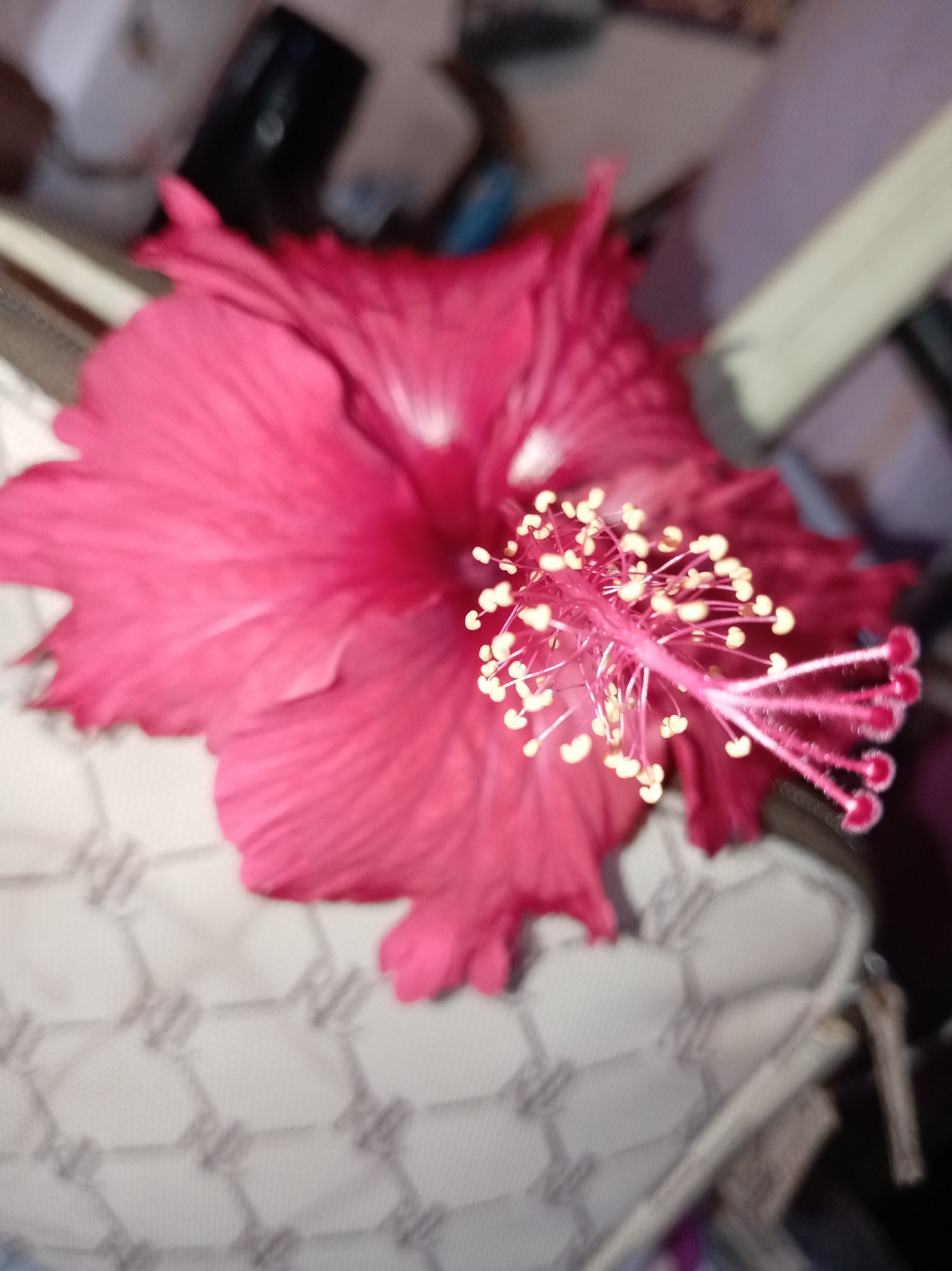 The image displays a single, vibrant pink-red hibiscus flower, photographed in an indoor setting within Parroquia Ocumare, Venezuela. The flower is centrally positioned and in sharp focus, showcasing its five broad petals with slightly ruffled edges. Its prominent reproductive column extends from the center, featuring numerous yellow-tipped anthers clustered along the filament tube, which culminates in a five-lobed stigma with distinct pinkish tips. The flower rests on a light-colored, possibly off-white, textile surface patterned with repeating geometric shapes. The background is out of focus, revealing indistinct blurred shapes, including a dark cylindrical object in the upper left and a light rectangular object extending diagonally in the upper right.