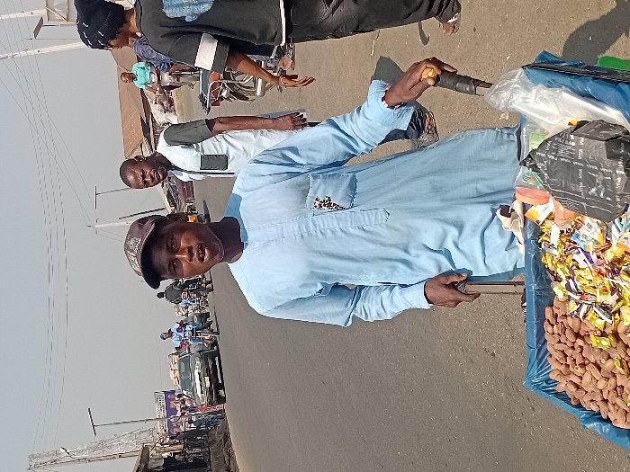 A man in a light blue outfit and cap stands in the street with a cart. The cart is full of candies and peanuts, displayed in blue plastic lining. Other people are visible in the background, some on motorcycles, against a backdrop of buildings, cars, and utility poles. The image is slightly rotated to the left.