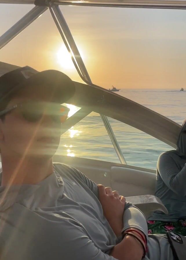 people on a boat, likely fishing. The sun is setting or rising, creating a warm glow. Initially, two men are visible in the boat's cabin. The camera pans to show other people setting up fishing gear on the back of the boat. Fishing rods are prominently displayed. The boat is on the ocean, with land visible in the background. Other boats are in the distance.