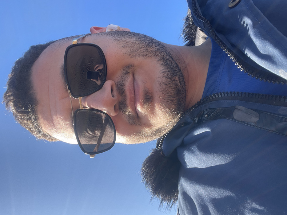 The image depicts a close-up, upward-angled outdoor self-portrait of an adult male beneath a clear, bright blue sky. The male has dark hair, a short beard, and is wearing large, dark-lensed sunglasses with gold-colored frames. A reflection of a smartphone held by a hand is visible in the left sunglass lens, indicating the subject is taking the photograph. He is dressed in a blue jacket with a dark faux fur trim on the hood, over a blue t-shirt. A white wireless earbud is present in his right ear. Strong sunlight illuminates the scene. The image provides no visual indicators to identify the location as Zarautz, Spain.