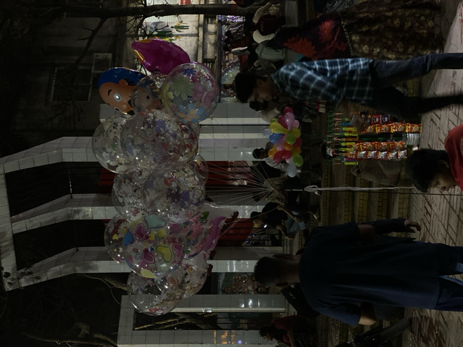 A nighttime scene captured in Narayanganj, Bangladesh, depicts a public area active with individuals and vendors. Prominently featured in the upper-center is a large cluster of clear, spherical balloons internally decorated with colorful confetti, heart shapes, and cartoon characters, including Hello Kitty. Within this cluster, opaque character balloons, such as one with a blue-haired, orange-faced figure, are also visible. These balloons are tethered by multiple thin strings extending downwards. In the foreground, an adult male wearing a dark blue t-shirt and dark trousers stands with his back to the viewer, facing into the scene. To his right, a second adult male, partially blurred from motion, walks leftward, clad in a blue plaid shirt and dark trousers. A young individual in a red t-shirt is seated on the ground in the lower-center foreground, looking left. Near the ground, to the right of the seated individual, a display rack exhibits multiple rows of packaged snack items. Further into the mid-ground, a vendor holds a stick featuring a collection of small, multicolored balloons. Multiple individuals are seated or resting on a series of concrete steps that lead up towards a background structure. This structure is characterized by distinct white-tiled vertical pillars or slabs. Artificial lighting illuminates parts of the scene, creating areas of brightness and deep shadow against the dark night sky. Tree branches are discernible against the sky on the upper right, and a wall with faint imagery is visible on the far right.