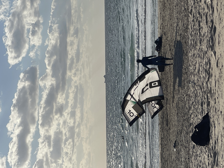 The image depicts a daytime coastal scene on a sandy beach within the Hof HaCarmel Regional Council, Israel. In the mid-ground, a lone individual, silhouetted against the bright horizon, stands barefoot on the wet sand, facing the ocean. This person is wearing a dark, full-body wetsuit and holds or manipulates a large, partially deflated kite. The kite is primarily white and black with visible markings, including the number "10" and letters "OR." To the right of the individual, near the water's edge, an additional dark bag or piece of equipment rests on the sand. In the lower-left foreground, a dark, irregularly shaped object, possibly a rock or debris, is visible on the dry sand. The ocean occupies the mid-ground, exhibiting distinct wave patterns breaking near the shore. A smaller, dark object is discernible floating in the waves further out to the left. On the distant horizon, a large cargo ship or similar vessel is visible. The sky above is filled with multiple layers of white and grey cumulus clouds, interspersed with patches of clear blue sky. The lighting suggests a partly cloudy day, with the sun likely positioned behind the clouds, creating a slightly diffused, bright background.