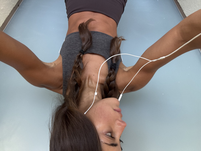 woman hanging upside down wearing a gray sports bra and dark gray leggings. She has brown hair in two braids, and is wearing white earbuds. Her arms are outstretched, and she is facing towards the camera. The background is light blue.