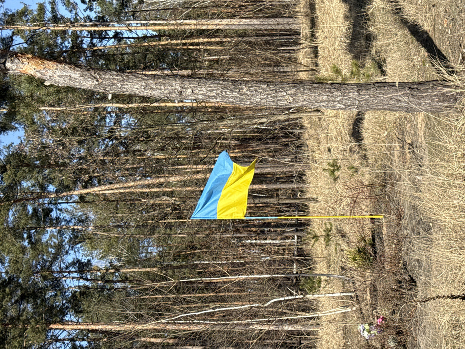 The scene is set in a clearing within a pine forest in Moshchun, Ukraine, under a clear blue sky. A Ukrainian flag, horizontally divided with blue above yellow, is displayed prominently in the mid-ground, attached to a yellow pole that exhibits a blue segment near the flag's upper edge. The flag is partially unfurled, indicating air movement. In the immediate foreground, to the right, stands a textured, vertical tree trunk, identified as a pine, with its upper portion visibly broken or damaged. The ground cover consists primarily of dry, light-brown grass and sparse, dormant vegetation, interspersed with small patches of darker earth and fledgling shrubs. In the lower-left corner, a small cluster of indistinct objects, appearing to be flowers or memorial markers, is visible amongst the dry foliage. No individuals are present, and no active interactions are depicted.