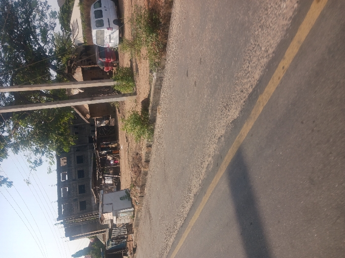 The image displays a street scene in Adankolo, Nigeria, under clear daylight. A two-lane asphalt road with a solid yellow dividing line runs diagonally from the bottom-left to the mid-right foreground. The road's right edge transitions to a raised concrete curb, followed by a dusty, unpaved area containing sparse green bushes. In the mid-ground, a prominent multi-story, unfinished concrete building, approximately four stories high with multiple open window frames, stands on the left. Directly in front of this structure is a cluster of smaller, makeshift market stalls constructed from wood frames and various roofing materials. Several indistinct human figures are present within or near these stalls, indicating activity. To the left of these stalls, a small white rectangular structure, possibly a kiosk or utility box, is positioned near the road. To the right of the market stalls, two utility poles with visible overhead wires stand vertically. Behind these poles and a large tree with dense green foliage, a smaller, single-story building with a mud-brick or unpainted facade is visible. Adjacent to this, a red vehicle is partially obscured by a utility pole, and a white compact van is parked facing away from the viewer.