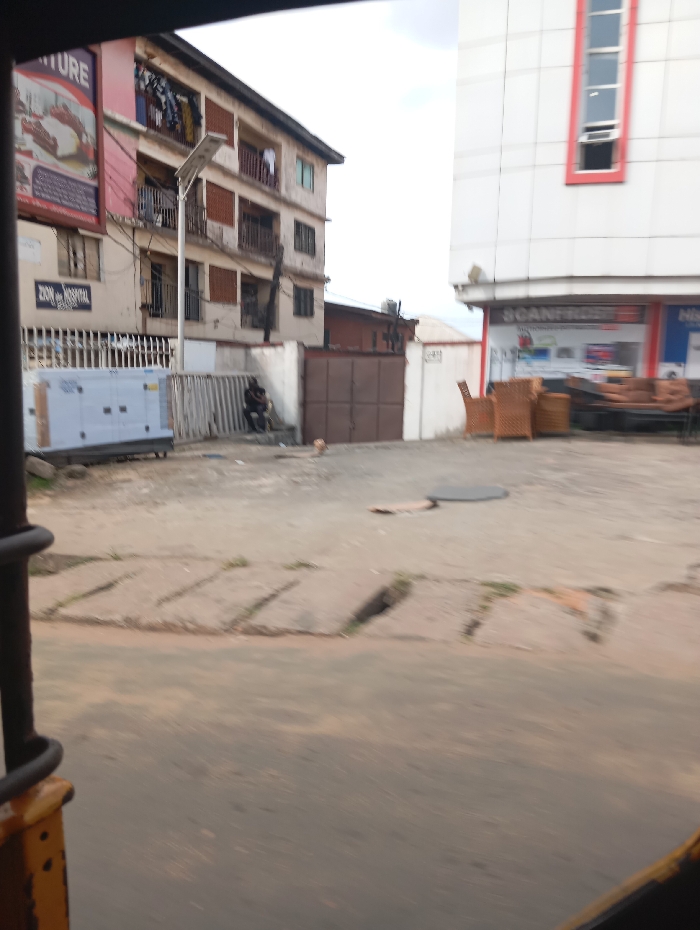 A blurry street view shows an aged building with balconies across from a modern white building with a red-framed window. Signs are visible on both structures. A generator sits near the building on the left, next to a tall fence and a closed gate. A person sits near the fence. Outside the white building, there are arranged chairs and furniture. The street surface appears uneven and cracked. A yellow and black object is visible in the foreground on the left.