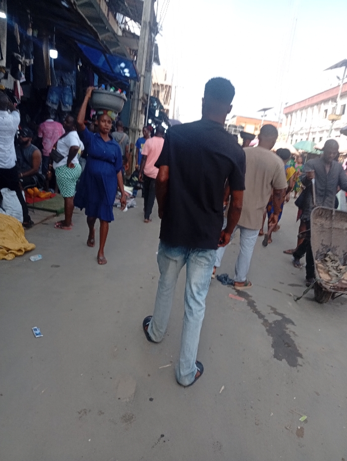 The image depicts a busy street scene in Fegge, Nigeria, under daylight conditions, showing an active market environment. In the immediate foreground, the back of a male subject wearing a black t-shirt, light blue jeans, and dark flip-flops is visible, walking away from the camera. To his left, a dark-colored mobile phone lies face-up on the uneven grey pavement, which also features scattered debris, dark stains, and wet patches. In the mid-ground, a woman wearing a navy blue dress walks towards the camera, balancing a grey basin filled with assorted items, including small bottles, on her head. She wears simple sandals. Behind her, other pedestrians move through the area, including a man in a tan t-shirt and light trousers walking away, and a person pushing a grey, two-wheeled cart on the right. The left side of the street is lined with market stalls under blue awnings, displaying clothing items such as jeans and shirts. Multiple individuals are visible among the stalls and in the background, including a man in a white shirt and another in a pink shirt. Tall buildings and overhead utility lines are visible against the bright, clear sky in the background.