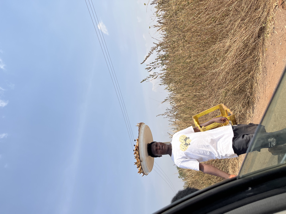 The image depicts a young adult male street vendor in Nandu, Nigeria, captured from the perspective of a vehicle