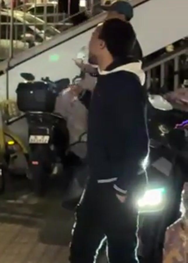 Two men stand outdoors at night. One man, wearing a dark jacket with a white hood, dark pants, and a trimmed beard, is the focal point. He holds a cigarette in his left hand and gestures with his right as he speaks, facing towards the camera. Behind him and slightly to his right stands another man wearing a cap, obscured by the first man. Two motorcycles are parked behind them with their headlights on. A bicycle is parked further to the left. An elevated walkway is visible in the background, and the overall environment is urban, with streetlights providing illumination.
