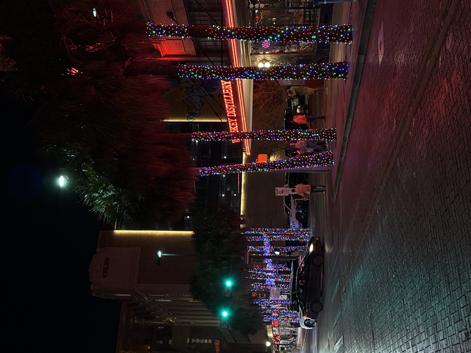 Nighttime cityscape featuring a brick-paved street lined with trees adorned with colorful holiday lights. Buildings flank both sides, including one marked "KRESS" and another with "WHISKEY DISTILLERY" illuminated. A few pedestrians are visible, and parked cars line the street. Green traffic lights are lit, contrasting with the warm tones of building and street lights. The scene is festive and vibrant.