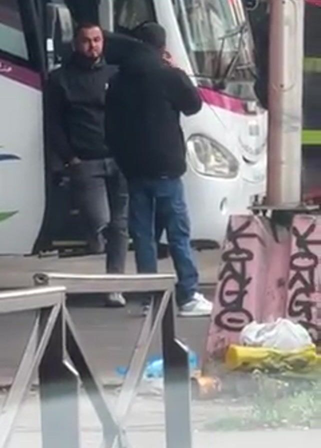 The scene features two men standing near a bus. The bus is white with pink and purple accents. One man is wearing a black jacket, blue jeans, and white sneakers. He is facing the bus and gesturing with his hand. The other man is wearing a black jacket and gray jeans. He stands with his hands in his pockets, looking towards the camera's perspective. The area around them appears to be an urban setting with graffiti on a nearby concrete barrier. There are also some plastic bags and other debris on the ground.